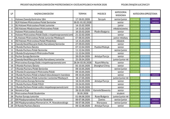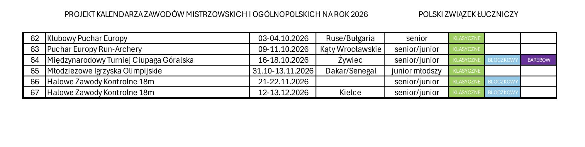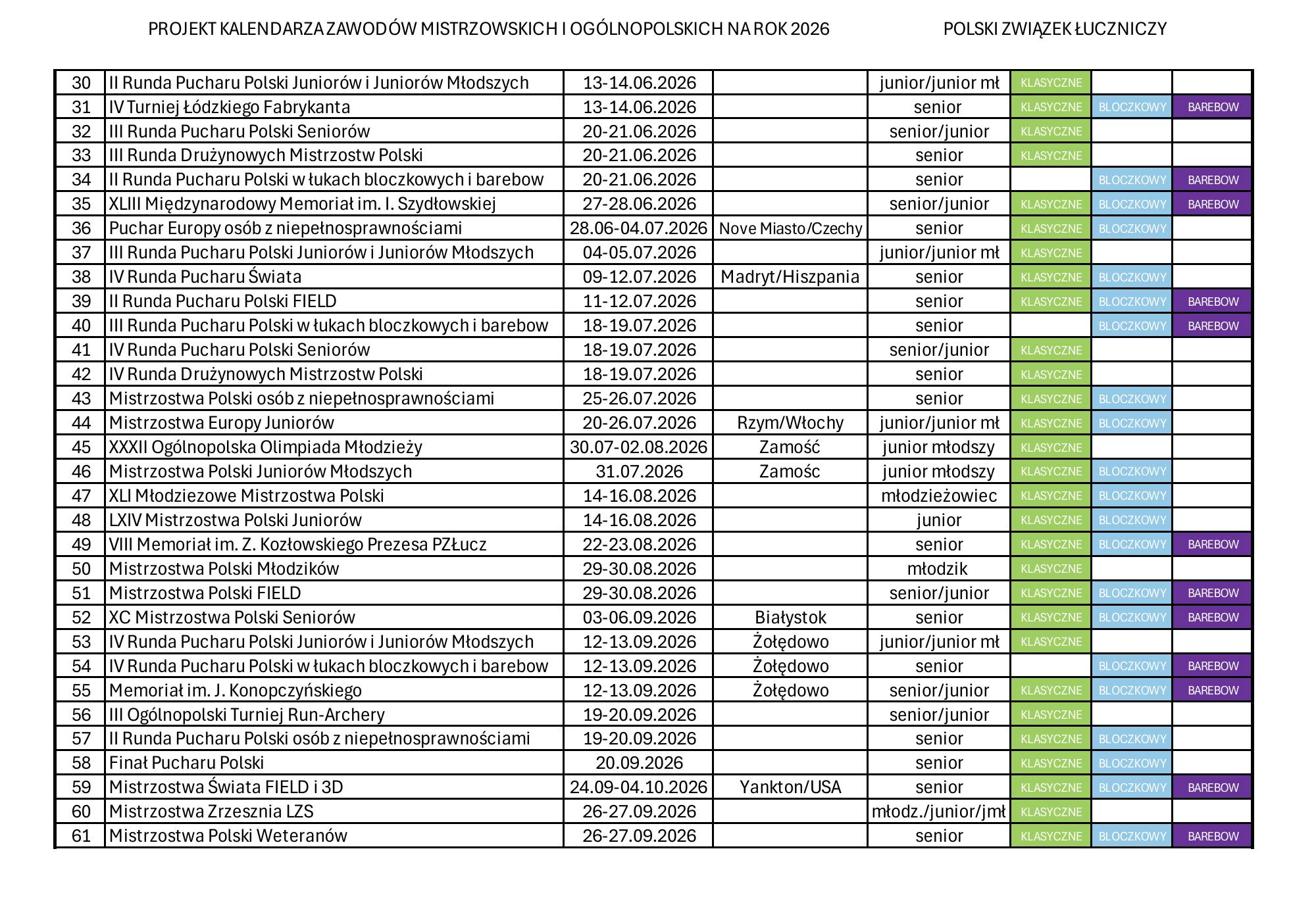 Polski Związek Łuczniczy opublikował projekt kalendarza zawodów mistrzowskich i ogólnopolskich Polskiego Związku Łuczniczego w 2026 roku.